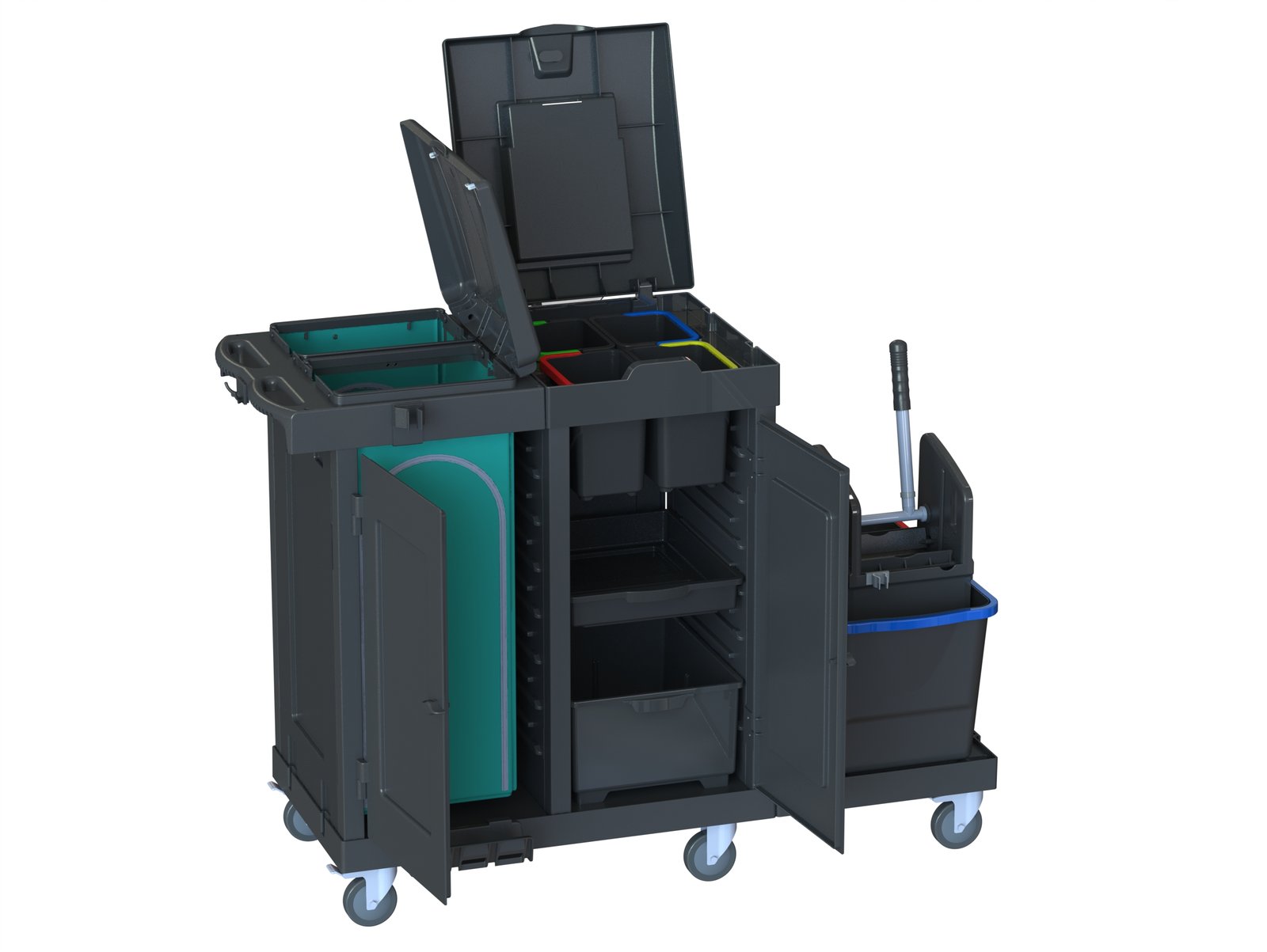 4 x 6 liter buckets in black with handles in blue, green, yellow, red
