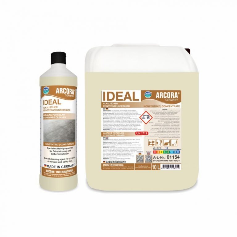 IDEAL is a special cleaning agent concentrate for fine stoneware and safety tiles. Can be used as a basic cleaner as well as a maintenance cleaner. Easily removes even stubborn, oily and greasy dirt. Cleans deep into the pores, thoroughly and intensively. IDEAL is EDTA-free and can therefore be disposed of in the sewage system without hesitation.