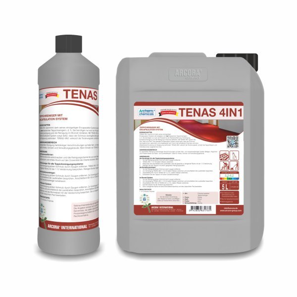 TENAS 4IN1 offers a unique encapsulation system that replaces five classic carpet cleaners with just one product. You need only one product for stain removal, precleaning, extraction cleaning, the Bonnet cleaning and the dry cleaning system with the ANIKO 350 DUO BRUSH. You can save time, money and space. The special encapsulation system ensures that the dirt is broken, bound and encapsulated. The polymers contained prevent re-soiling and graying. TENAS 4IN1 shortens the drying time, protects the carpet fibers and leaves a pleasant fragrance.